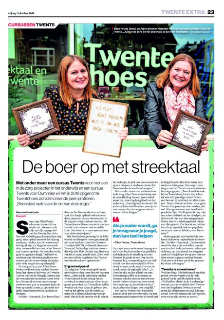 Mooi artikel in de kraant van 11 oktober 2019 oaver oonze taal en 't Twentehoes