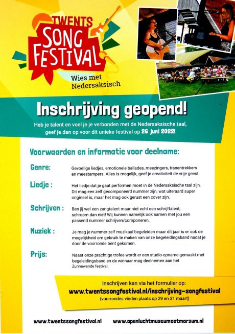 Achter de schermen is de afgelopen tijd hard gewerkt aan de volgende editie van het Twents Songfestival. De werkgroep binnen het Openluchtmuseum Ootmarsum onder voorzitterschap van Hans Oude Breuil, heeft inmiddels alle belangrijke zaken geregeld.